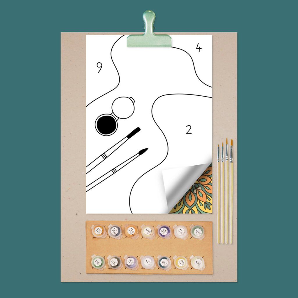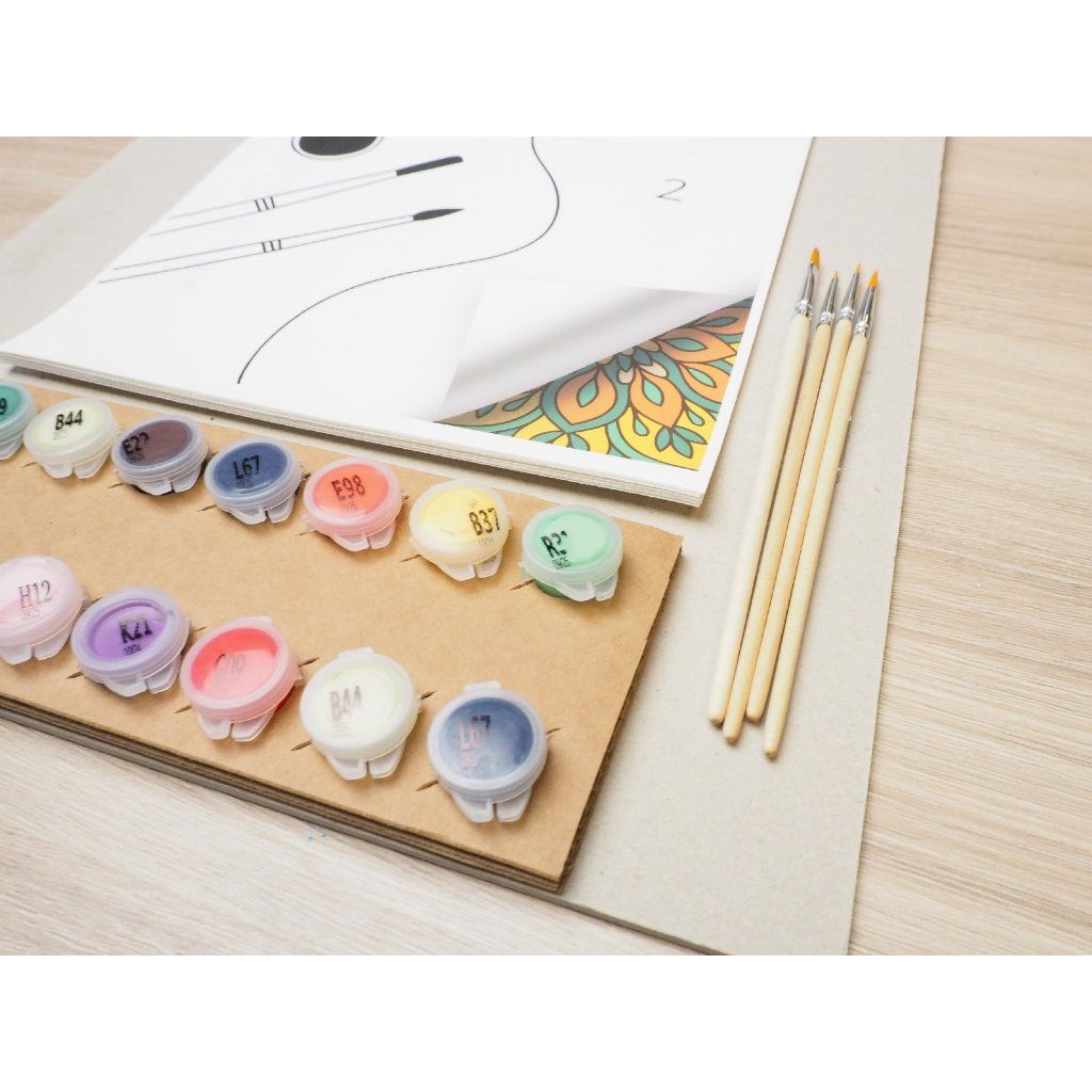 Sadrži 8 motiva na jednu temu, akrilne boje, kistove, držač za boje pričvršćen na čvrstu kartonsku podlogu i spajalicu koja sve drži zajedno. Samo otvori, uzmi kist i počni stvarati!